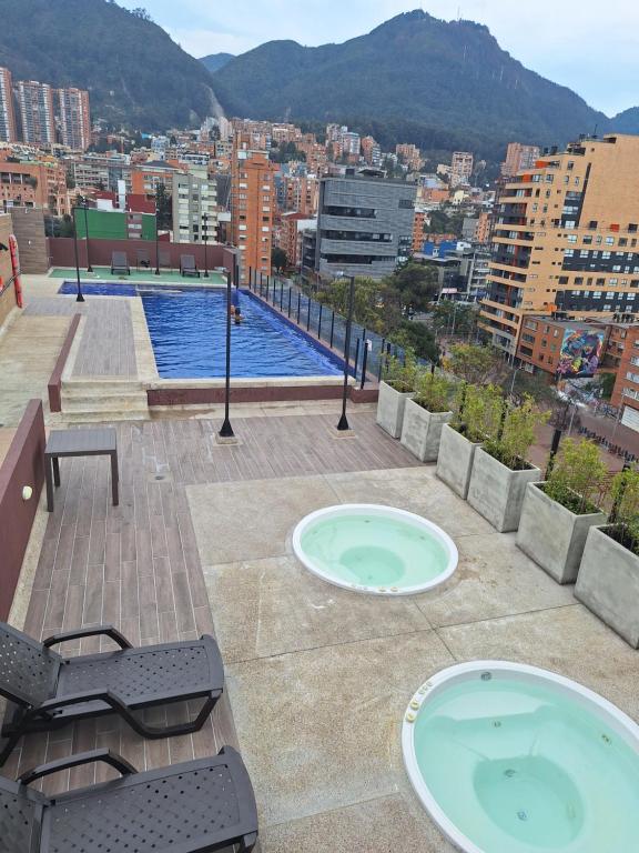 Atracciones turísticas próximas a Estudio en edificio con piscina climatizada: Parqe Público Socke Hippies (50 m), Parque Público Chapinero Central (250 m), Parque Portugal (500 m).