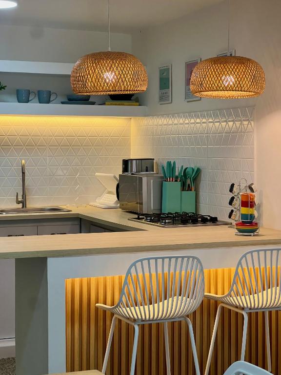 Zona de cocina, Nevera, Microondas, Cocina, Utensilios de cocina, Productos de limpieza, Cafetera, Mesa de comedor, Copas de vino