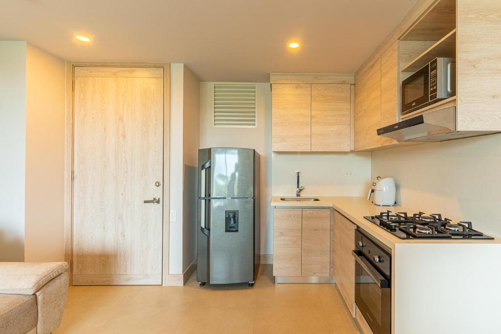 Zona de cocina, Nevera, Microondas, Cocina, Utensilios de cocina, Horno, Fogones, Cafetera, Copas de vino