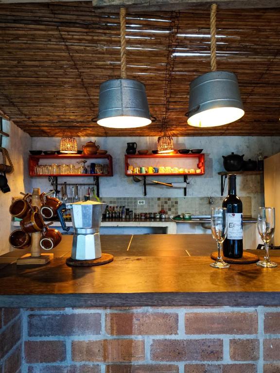 Nevera, Cocina, Fogones, Tostadora, Mesa de comedor, Copas de vino