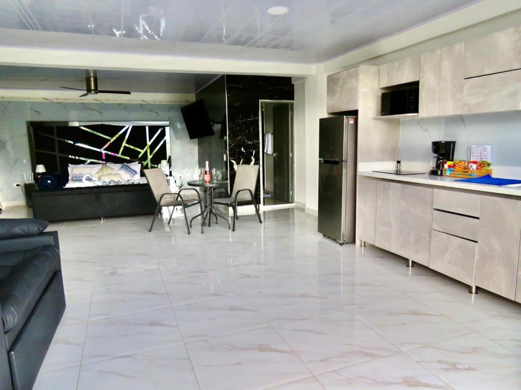 Zona de cocina, Nevera, Microondas, Cocina, Utensilios de cocina, Fogones, Productos de limpieza, Cafetera, Mesa de comedor, Copas de vino