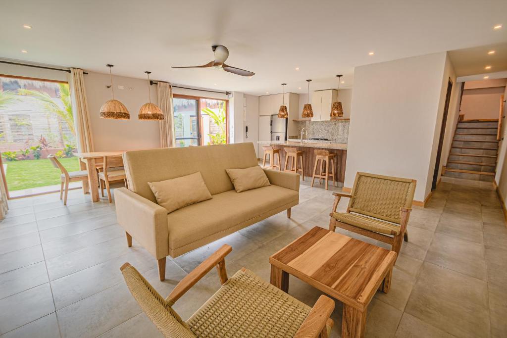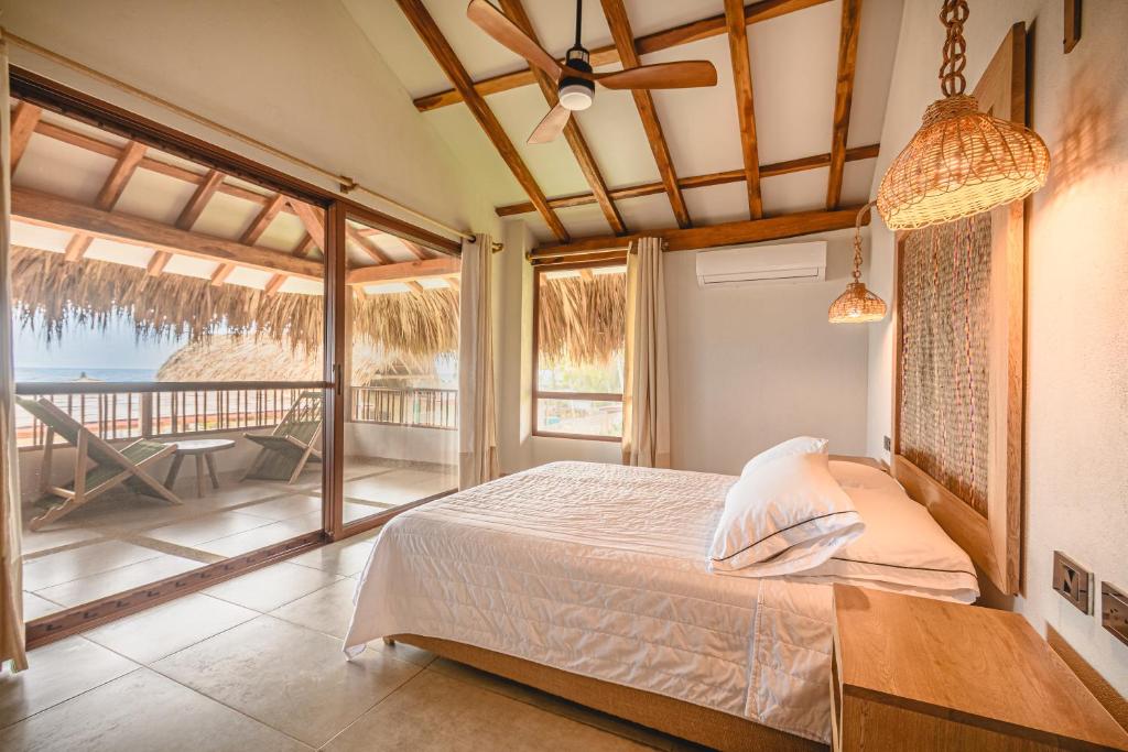 Las opciones incluyen: Villa con vistas al mar, Habitación Triple con vistas al mar, Villa con vistas al jardín, Villa con piscina privada, Suite con cama extragrande y vistas al mar, Habitación Cuádruple Estándar, Habitación Cuádruple con vistas al mar.
