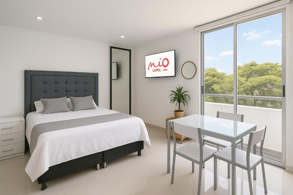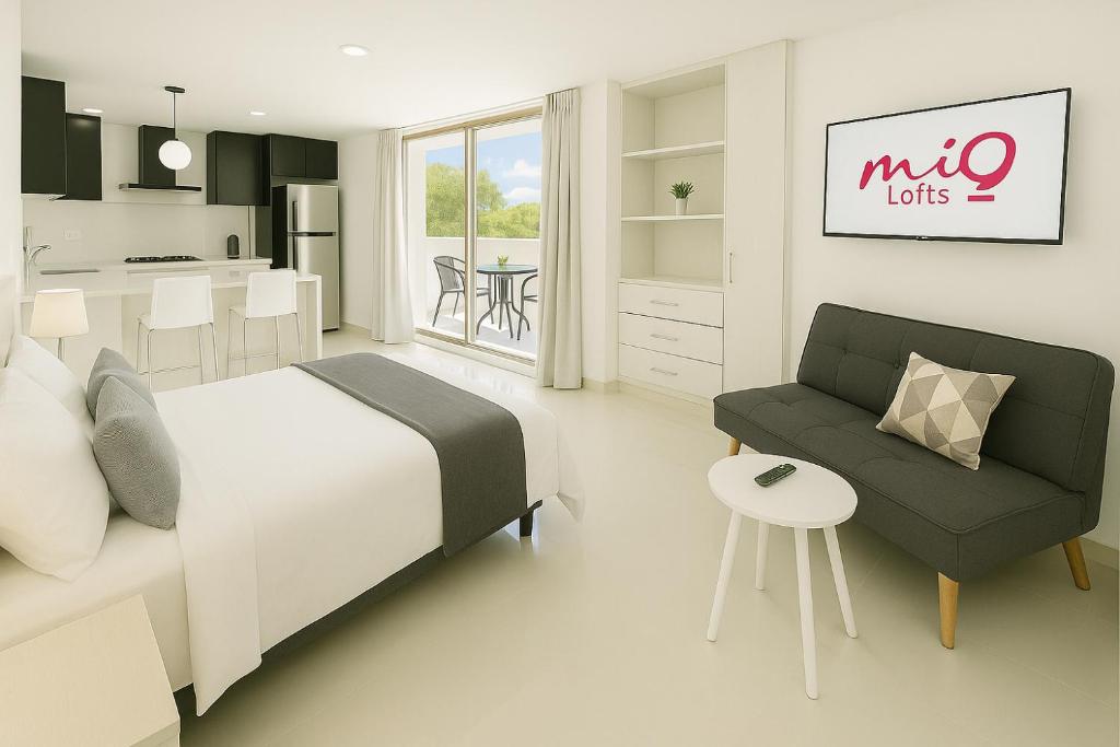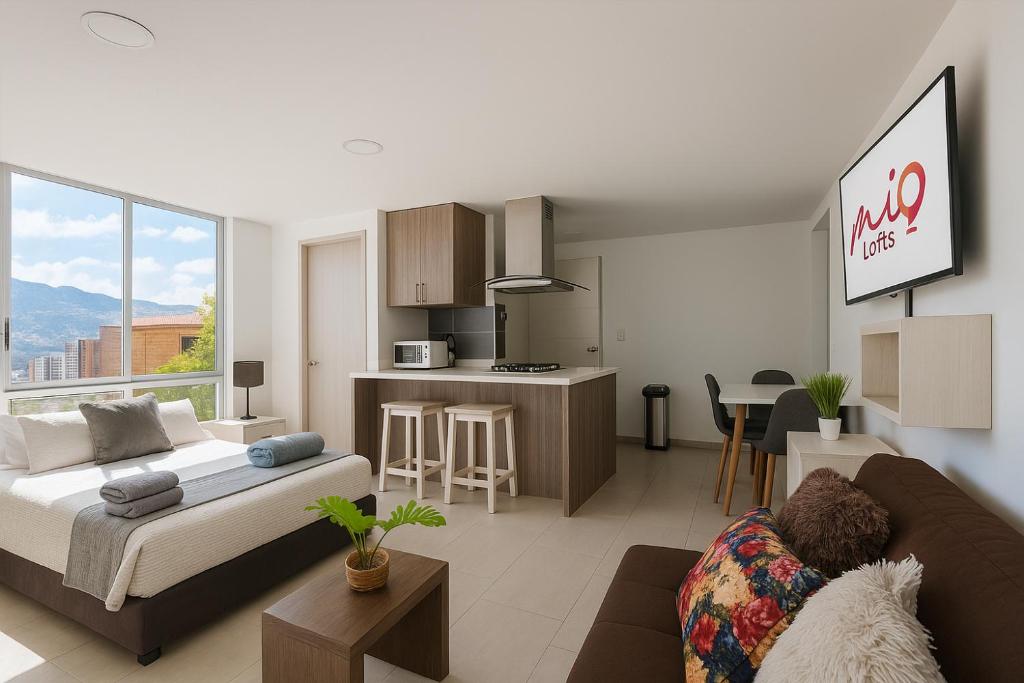 Estudio con cama extragrande y sofá cama