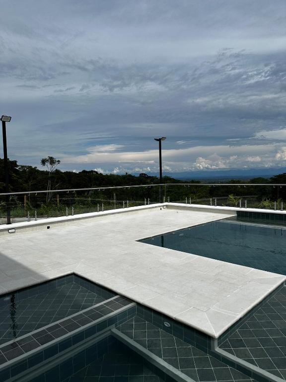 Área de piscina con vistas naturales.
