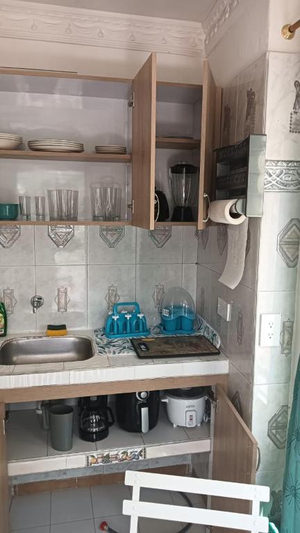 Zona de cocina, Nevera, Lavadora, Productos de limpieza, Cafetera, Mesa de comedor
